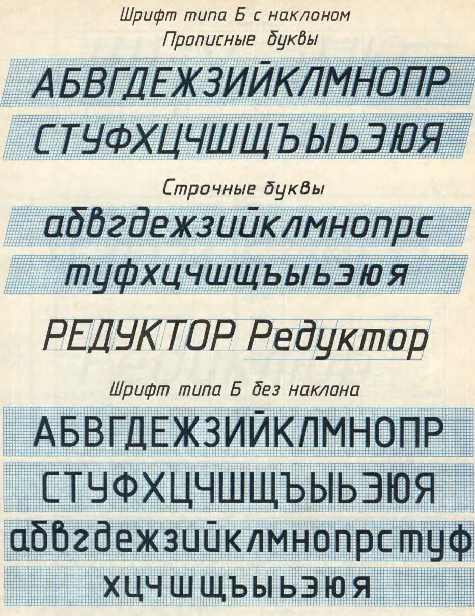 Чертежи, схемы и другие конструкторские документы содержат необходимые надписи: название изделий, размеры, данные о материале, технические требования, спецификации. Если надписи сделаны небрежно, то при изготовлении деталей по таким чертежам возможны ошибки. Типы и размеры шрифтов, цифр, знаков и т.д. устанавливает ГОСТ 2.304-81. Размер шрифта h – величина, определенная высотой прописных букв в миллиметрах. Толщина линии шрифта d зависит от типа и высоты шрифта ГОСТ устанавливает следующие размеры шрифта: (1,8); 2,5; 3,5; 5; 7; 10; 14; 20; 28; 40. Стандартом установлены 2 типа шpифтов: тип А и тип Б, каждый из котоpых можно выполнить или без наклона, или с наклоном 75 гpадусов к основанию стpоки. В учебной практике предпочтительнее применять шрифт типа Б с наклоном 75 градусов.