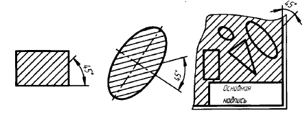 Наклонные параллельные линии штриховки должны проводиться под углом 45° к линии контура изображения, к его оси или к линии рамки чертежа (рисунок 13).