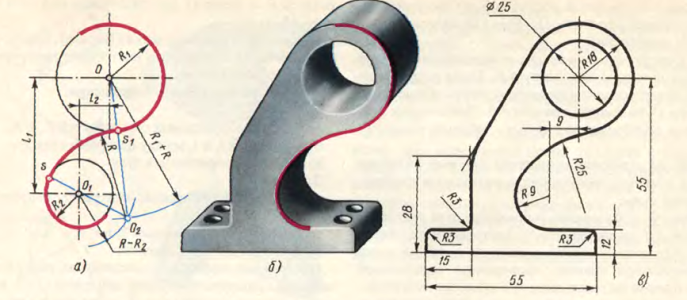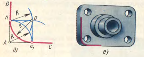 При вычерчивании контуров технических деталей (рисунок 38) и в других технических построениях часто прихоится выполнять плавные переходы от одной линии к другой и от одной окружности к другой. Такие плавные переходы называются сопряжениями.