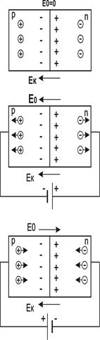 Якщо напрямок зовнішнього електричного поле Е0 збігається з напрямком Ек, це призводить до збільшення контактної різниці потенціалів (або висоти потенціального бар’єра). Струм через контакт дорівнює нулю. Такий напрямок поля називають зворотнім (рис. 3.1.2 б). Таким чином, електронно-дірковий перехід має односторонню провідність, що використовується для випрямлення змінного струму. Прилади, дія яких основана на цій властивості, називаються напівпровідниковими діодами. На рис.3.1.3 показана залежність сили струму, що протікає через n-р перехід, від напруги. Кривій ОА відповідає прямий струм, що обумовлений рухом основних носіїв електричного заряду. Сила прямого струму залежить від напруги — вона збільшується із збільшенням напруги. Сила зворотнього струму від напруги практично не залежить. Якість напівпровідникового діода оцінюється коефіцієнтом випрямлення k, який дорівнює відношенню сили прямого струму до зворотнього, виміряних при однаковій напрузі