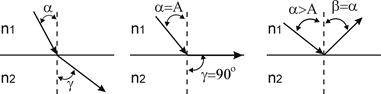 Рис.4.2.1. Хід променів на межі поділу двох середовищ (n1>n2). При проходженні променя світла з оптично густішого середовища n1 (рис.4.2.1 зліва) в менш оптично густе середовище n2, (із скла в воду), згідно закону заломлення, кут падіння a менший від кута заломлення g. При деякому значенні кута падіння a = А (рис.4.2.1 у центрі) кут заломлення g стане рівним 90°, тобто заломлений промінь не входить у друге середовище, а ковзає на межі поділу середовищ. Кут падіння А, якому відповідає кут заломлення g = 90°, називається граничним. При значеннях кута a більших кута А світло буде повністю відбиватися в перше середовище; таке явище називається повним внутрішнім відбиванням (рис.4.2.1 справа). Згідно закону заломлення: