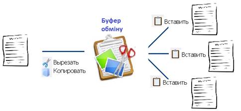 Рис. 5 Схема роботи буфера обміну Групи об'єктів. Перед операціями копіювання чи пересилання групи об'єктів потрібно спочатку відмітити цю групу об'єктів. Щоб відмітити групу файлів, розташованих у довільному порядку, необхідно клацнути по їх значках, утримуючи клавішу [ Ctrl ], а якщо вони розміщені один за одним, - клавішу [ Shift ] (клацнути на першому та на останньому). Для виділення всіх об'єктів поточного вікна слід використовувати команду Виділити Все [ Ctrl+А ]. Копіювання і переміщення об'єктів. Дії копіювання та переміщення об’єктів виконуються аналогічно. Для копіювання використовують команду Копіювати. Для переміщення використовують команду Вирізати. При копіюванні на новому місці створюється тільки копія початкового об'єкта - на старому місці він залишається без змін. При переміщенні об'єкта він переноситься у нове місце. Способи копіювання і переміщення об’єктів: · Панель команд. · Контекстне меню. · Клавіатура (Ctrl+Insert - копіювати; Ctrl+ X - вирізати; Shift+ Insert - вставити). · Відповідні кнопки панелі інструментів. · Перетягування мишею з вікна у вікно. Порядок копіювання і пересилання об’єктів: · Виділити об’єкт. · Будь-яким способом викликати команду Копіювати (Вирізати). · Відкрити папку куди потрібно розмістити об’єкт. · Будь-яким способом викликати команду Вставить. З вікна у вікно. Легко виконуються операції копіювання і переміщення об'єктів з однієї відкритої папки до іншої (з вікна у вікно). При виконанні цих операцій мають бути чітко визначені і відкриті у окремих вікнах джерело та місце призначення. Виконуючи ці операції, використовують метод перетягування значків за допомогою вказівки миші: 1. Сумістити вказівку миші з вибраним об'єктом, натиснути праву кнопку миші; 2. Не відпускаючи кнопку миші, перетягнути об'єкт в інше вікно; 3. Відпустити кнопку миші - у вікні з'явиться меню в якому є команди: Копіювати, Перемістити, Створити ярлик, Відмінити, ви маєте змогу вибрати будь-який пункт. Якщо при перетягуванні значків об'єктів утримувати не ліву, а праву кнопку миші, то після її відпускання на місці призначення з'являється контекстне меню. Якщо потрібно зробити копію об'єкта на флеш-диску чи відправити об'єкт за допомогою електронної пошти, то можна використати команду Відправити пункту горизонтального меню Файл, тільки перед вибором цієї команди слід виділити об'єкт. Для відміни операцій (якщо вони проведені помилково) потрібно скористатися командою Відмінити меню Правка або натиснути комбінацію клавіш [Ctrl+Z], або натиснути кнопку на панелі інструментів: Область переходів (Провідник). У вікні папки з лівої сторони відображається панель переходів між папками (дерево каталогів). На правій панелі - вміст відкритої папки (рис. 6).