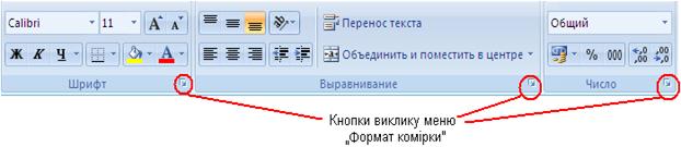 Рис. 4 Форматування комірок. Надати таблиці привабливого вигляду можна за допомогою команд форматування комірки. Більшість цих команд винесено на панель інструментів Главная. Всі команди форматування знаходяться в одному діалоговому вікні. Діалогове вікно викликають у кнопці меню на панелі інструментів Главная або у контекстному меню до комірок. Вікно має декілька вкладок: Число, Виравнивание, Шрифт, Граница, Вид, Защита (Рис. 5).