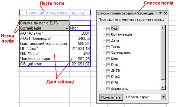 Рис. 1 Приклад зведеної таблиці Для створення зведеної таблиці за новими параметрами не потрібно будувати нову таблицю, це перевантажує пам’ять і може призвести до порушень в роботі програми. Достатньо скористатися списком полів у вже побудованій таблиці. Потрібно лише «перетягнути мишею» у структуру таблиці потрібні поля із списку полів, і аналогічно видалити зайві. Поля легко перетягуються з панелі на таблицю і навпаки. Якщо при переміщенні поля ми отримали плутанину даних, то можна відмінити дію відповідною командою, або перетягнути поле знову на список полів. Існує можливість групування даних за окремими полями (наприклад, групування по кварталах у полі «Дата». Для цього на полі Дата викликають контекстне меню і вибирають команду Групування-Згруппувати, а потім в діалоговому вікні вибрати тип групування (по тижням, місяцям, кварталам). Можна також проводити різні типи обчислень в таблиці. Окрім суми по полю можна робити інші обчислення: визначати кількість значень, середню, мінімальну і максимальну величини та інші статистичні дані. Для цього потрібно лише двічі «клікнути» по полю за яким ведуться обчислення і вибрати потрібну дію У зведеній таблиці можна двічі «клікнути» на числі в будь-якій клітинці таблиці, після чого будуть показані всі дані, що його утворюють. Ті хто працює з Excel постійно стверджують, що ця функція не описана в офіційному й загальнодоступному посібнику з Excel. Слід також зауважити, що ці дані з’являються на нових листах, тому слід слідкувати за їх появою: непотрібні листи видаляти, а потрібні перейменовувати для повторного їх використання і не допускати їх дублювання.