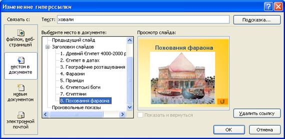 Виділіть слово ховали і в контекстному меню виберіть команду Гиперссылка. Відкриється діалогове вікно. Потрібно вибрати кнопку В текущем документе. З’явиться список слайдів документа, в якому треба вибрати слайд, куди перейти за посиланням (в даному випадку на слайд Поховання фараона) (Рис. 17).