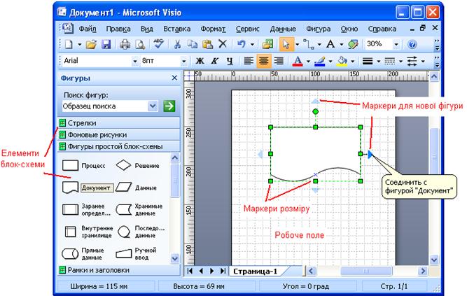 Рис. 4 Створення схеми починається з перетягування мишею на робочий лист першого елементу (фігури). Навколо елементу з’являються маркери для додавання нового елементу. Щоб додати наступний елемент у схему потрібно виділити його на панелі елементів і натиснути мишею маркер (один з синіх трикутників) на першому елементі. При цьому з’явиться об’єкт разом зі з’єднувальною лінією (Рис.5).