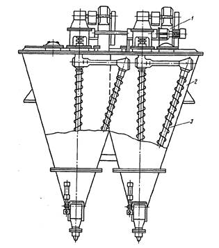 Рис. 9 Общий вид смесителя-усреднителя с планетарным шнековым перемешивающим устройством: 1 — привод; 2 — конический корпус; З — перемешивающее устройство