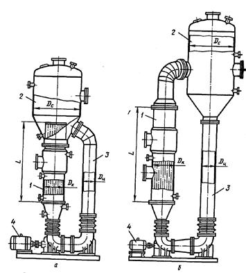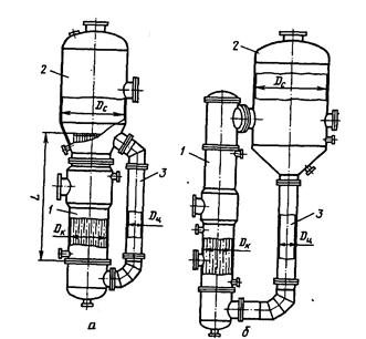 Рис. 1 Выпарные аппараты с естественной циркуляцией раствора: а — с соосной греющей камерой; б— с вынесенной греющей камерой; 1- греющая камера; 2 сепаратор; 3— циркуляционная труба; Dс, Dк , Dц — диаметры соответственно Сепаратора, камера и циркуляционной трубы; L — длина камеры Выпарной аппарат состоит из сепаратора, греющей камеры и циркуляционной грубы. Сепаратор представляет собой цилиндрическую емкость с эллиптической крышкой, присоединенной с помощью болтов к греющей камере. В сепараторе для отделения капелек жидкости от вторичного пара устанавливают различной конструкции отбойники. Греющая камера выполнена в виде вертикального кожухотрубчатого теплообменника, и межтрубчатое пространство которого поступает греющий пар, а в греющих трубках кипит раствор. Нижние части сепаратора и греющей камеры соединены циркуляционной трубой. Естественная циркуляция возникает в замкнутой системе, состоящей из необогреваемой циркуляционной трубы и кипятильных труб. Если жидкость в трубах нагрета до кипения, то в результате выпаривания части жидкости в этих трубах образуется парожидкостная смесь, плотность которой меньше плотности самой жидкости. Таким образом, вес столба жидкости в циркуляционной трубе больше, чем в кипятильных трубах, вследствие чего происходит циркуляция кипящей жидкости по пути: кипятильные трубы - перовое пространство - циркуляционная труба - трубы и т. д. При циркуляции повышается коэффициент теплоотдачи со стороны кипящей жидкости и снижается образование накипи на поверхности труб. Для естественной циркуляции требуются два условия: 1- достаточная высота уровня жидкости в циркуляционной трубе, чтобы уравновесить столб парожидкостной смеси и создать необходимую скорость; 2 -достаточная интенсивность парообразования в кипятильных трубах, чтобы парожидкостная смесь имела возможно малую плотность. Представленные на рис. 1 аппараты выгодно отличаются от устаревших конструкций аппаратов с центральной циркуляционной трубой. Наличие обогреваемой центральной циркуляционной трубы приводило к снижению интенсивности циркуляции. Парообразование в кипятильных трубах определяется физическими свойствами раствора (главным образом вязкостью) и разностью температур между стенкой трубы и жидкостью. Чем ниже вязкость раствора и чем больше разность температур, тем интенсивнее парообразование и больше скорость циркуляции. Для создания интенсивной циркуляции разность температур между греющим паром и раствором должна быть не ниже 10°С. Выпарные аппарату, показанные на рис. 1, имеют площадь поверхности теплопередачи от 10 до 1200м2, длину кипятильных труб от 3 до 9 м. в зависимости от их диаметра. Диаметр кипятильных труб составляет 25, 38 и 57 мм. Избыточное давление в греющей камере 0,3 -1,6 МПа, а в сепараторе вакуум примерно 93,0 кПа. Соотношение площадей сечения циркуляционной трубы и греющей камеры составляет не менее 0,3. Выпарные аппараты с естественной циркуляцией отличаются простотой конструкции и легкодоступны для ремонта и очистки. Выпарные аппараты с принудительной циркуляцией раствора позволяют повысить интенсивность циркуляции раствора и коэффициент теплопередачи. На рис.2 показаны такие аппараты с соосной и вынесенной греющей камерами. Циркуляция жидкости производится пропеллерным или центробежным насос