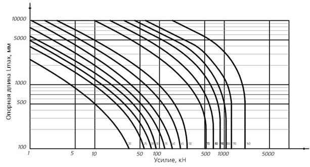 Рисунок 2.13 – График зависимости опорной длины гидроцилиндра от усилия на штоке