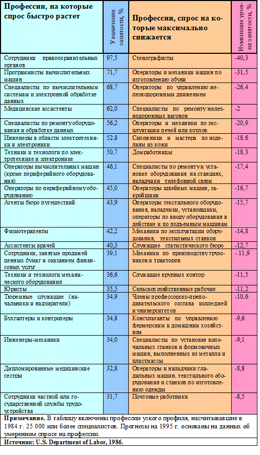 В промышленно-развитых странах труд стал значительно сложнее, чем в племенных обществах, изученных Малиновским. В связи с модернизацией экономики трудовые роли глубоко меняются, часто в этой сфере происходят бурные перемены. На Кубе молодая женщина, которая работала прислугой до революции, сейчас стала оператором на телеграфе. В Каракасе мужчина средних лет, окончивший 8 классов, работает механиком в одной из крупнейших нефтяных компаний Венесуэлы. Десять лет назад он жил в маленьком городке и зарабатывал на жизнь сбором кофейных бобов для местного плантатора, в свободное же время занимался ремонтом автомобилей. Экономист Симон Кузнец отметил ряд перемен, обычно сопровождающих развитие экономики. Наблюдаются переход от сельскохозяйственного к несельскохозяйственному труду, расширение сферы услуг (например, повышение спроса на секретарей, банковских служащих, страховых агентов и т.п.) в большей мере, чем увеличение производства товаров, объединение многих местных небольших предприятий в крупные. (Как показано в табл. 16-3, эти тенденции, вероятно, сохранятся и в будущем.) Составляя прогноз на 1995 г., Министерство труда США сравнило тенденции к максимальному возрастанию и максимальному снижению спроса на определенные профессии, наблюдающиеся в наши дни и предполагаемые в будущем. Самым большим спросом пользуются почти все профессии, связанные с обслуживанием, особенно в области медицины, вычислительной техники, а также права и деятельности правоохранительных органов. В связи с дальнейшим развитием технологии, вероятно, понизится спрос на стенографисток и почтовых служащих; заметное снижение спроса на рабочую силу произойдет в сельском хозяйстве и промышленности. Какое воздействие оказывают эти структурные изменения на людей? Сначала мы рассмотрим роль рабочих в производстве товаров. Затем перейдем к анализу других ролей в крупных экономических организациях и в сфере услуг. Таблица 16-3. Оценка максимального повышения и снижения спроса на разные профессии в период с 1984 по 1995 г.