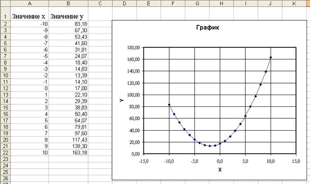 Спочатку введемо пояснювальний текст: у клітинку А 1 - «Значение х», в клітинку В 1 - «Значение y». Далі в осередку А 2 - А 22 введемо значення х. Для введення формули зробимо активної клітинку В 2, переведемо курсор в рядок формул і наберемо в ній «=4*А2+КОРЕНЬ(25+СТЕПЕНЬ(А2;2))+(СТЕПЕНЬ(А2;2)+12)». Функції СТЕПЕНЬ та КОРЕНЬ візьмемо за допомогою майстра функцій. Для заповнення клітинок В 3 - В 22 формулами можна ввести такий же текст у рядку формул, замінивши А 2 на А 3 - А 22 або скористатися операцією копіювання формул. Для побудови графіка виконаємо порядок дій, викладений вище. Звіт про роботу повинен містити короткий опис роботи та файл результатів.