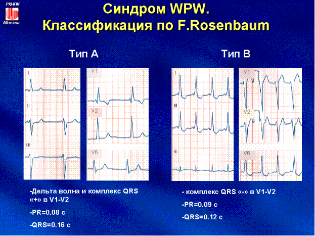 Синдром Вольфа-Паркинсон-Уайта.(синдром WPW) является врожденной патологией, характеризуется своеобразным нарушением проводимости с укорочением предсердно- желудочкового интервала и уширением или деформацией комплекса QRS Синдром Вольфа-Паркинсона-Уайта — наиболее частый синдром преждевременного возбуждения желудочков (его наблюдают у 0,1 0,3 % населения в общей популяции), возникающий при наличии дополнительного пучка Кента. Большинство людей при этом не имеют признаков заболевания сердца. У мужчин синдром обнаруживают чаще, чем у женщин. Пучок Кента — аномальный пучок между левым предсердием и одним из желудочков. Этот пучок играет важную роль в патогенезе синдрома WPW. Более быстрое распространение импульса через этот дополнительный проводящий путь приводит к: • 1) укорочению интервала P R (PQ); • 2) более раннему возбуждению части желудочков — возникает волна Δ, .При преждевременном возбуждении желудочков синусовые импульсы активируют часть желудочков через дополнительный пучок проводящей системы раньше остальной мышцы желудочков, активирование которой осуществляется по обычным проводящим путям. Анатомической основой преждевременного возбуждения желудочков является наличие дополнительных проводящих путей: пучка Кента, пучка Махайма, пучка Джеймса Клиника часто протекает бессимптомно, но могут наблюдаться приступы пароксизмальной тахикардии, трепетания и мерцания предсердий, желудочковой тахикардии. На ЭКГ регистрируется укороченный интервал PR,меньше 0,12 с., волна дельта,уширенный комплекс QRS выделяют два типа: тип А-с преждевременным возбуждением левого желудочка и тип Б- с преждевременным возбуждением правого желудочка. Лечение направлено на устранение приступов аритмии, прогноз благоприятный. Гениальное открытие синдрома ВПУ позволило по-новому подойти к изучению внезапной смерти больных молодого возраста. В последние 20 лет благодаря хирургическому лечению синдрома, проведению радиочастотной аблации ДПП не только устраняется синдром ВПУ, но и больные становятся практически здоровыми. Лечение