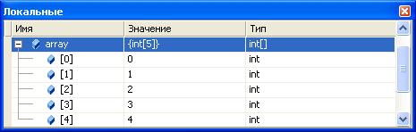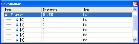 Размер массива уменьшился на 1. При этом на месте последнего элемента исходного массива остается старое значение, но оно не будет нас интересовать, так как формально не входит в состав результирующего массива (см. приведенное ниже окно Локальные, в котором отображаются локальные переменные текущего контекста, имена переменных, их значения и тип).