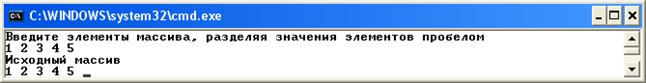 Ввод массива, т.е. заполнение элементов массива заданными значениями, можно осуществлять в цикле. Например, для ввода массива a размером 5 с элементами типа double необходимо использовать цикл. double[] a = new double[5]; string s; for (int i = 0; i < 5; i++) { s = Console.ReadLine(); a[i] = double.Parse(s); } Здесь при каждом вызове статического метода ReadLine() класса Console нужно вводить один элемент массива, после набора на клавиатуре значения очередного элемента нужно нажимать клавишу [Enter]. Введенный элемент помещается методом ReadLine()в переменную s типа string. Для того чтобы получить число из строкового представления числа необходимо вызвать статический метод Parse, который осуществляет разбор строки и возвращает экземпляр типа, который находится в строке. Если в строке храниться число типа double, то надо вызвать статический метод Parse типа double (см. п. 1.8.1). Можно набирать значения элементов массива на клавиатуре в одной строке, разделяя их пробелами (или любым другим разделителем). Например. int[] a = new int[5]; Console.WriteLine("Введите элементы массива, разделяя значения string s = Console.ReadLine(); string[] c = s.Split(' '); for (int i = 0; i < 5; i = i + 1) { a[i] = int.Parse(c[i]); } Console.WriteLine("Исходный массив"); for (int i = 0; i < 5; i++) Console.Write("{0:d} ", a[i]); Console.ReadKey();