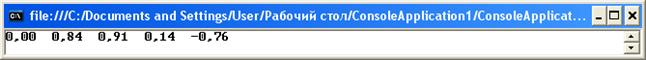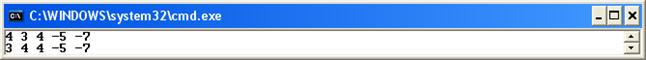 Здесь последовательно набираются на клавиатуре значения элементов массива, разделяемые пробелами (см. окно вывода). Введенная строка помещается в строковую переменную s. Далее производится разбор этой строки при помощи метода Split (см. п. 6). Определяется положение первого пробела в строке s и символы, расположенные перед ним пересылаются в первый элемент строкового массива c. Далее определяется положение следующего пробела в строке s и символы, расположенные между текущим и предыдущим пробелами, пересылаются в следующий элемент строкового массива c и т.д. пока не будет закончен разбор всей строки. В результате будет сформирован строковый массив с, каждый элемент которого содержит одно число в строковом представлении, Далее эти числа после преобразования по очереди пересылаются в массив a. Вывод массива осуществляется в строку с использованием формата: нулевой элемент вывода (элемент массива) выводится в формате d для типа int. В строке формата явно присутствует пробел, чтобы выводимые значения зрительно отделялись друг от друга. Этого же эффекта можно добиться, указывая в формате размер поля вывода на 1 больше требуемого. Например, Console.Write ("{0,2:d} ", a[i]); или Console.Write ("{0,-2:d} ", a[i]); для вывода однозначных чисел. В первом случае пробел выводится перед числом, во втором – после. Можно также выводить пробел отдельным оператором после вывода очередного элемента массива. Например, for (int i = 0; i < 5; i++) { Console.Write(a[i]); Console.Write(" "); } При выводе массива необходимо обеспечить наглядность и удобство восприятия выводимых данных. Вывод одномерного массива целесообразно осуществлять в строку, отделяя элементы массива друг от друга пробелами. При этом используется оператор Write, после выполнения которого перевода строки не происходит (см. предыдущий пример). Вывод одномерного массива в столбец осуществляется с использованием оператора WriteLine, после выполнения которого каждый раз происходит переход на новую строку. Например, for (int i = 0; i < 5; i++) { Console.WriteLine(array[i]); } Вывод может осуществляться в заданном формате. Например, double[] array = new double[5]; for (int i = 0; i < 5; i++) { array[i] = Math.Sin(i); Console.Write("{0,4:f} ", array[i]); } Console.WriteLine();