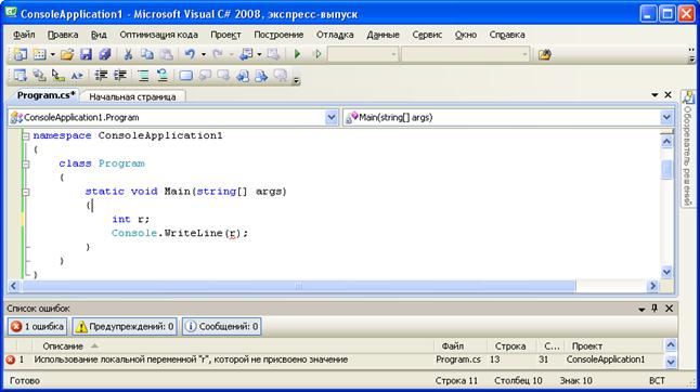 При наличии ошибок приложение не будет построено и в окне Список ошибок откроется список ошибок. Для того чтобы открыть окно список ошибок необходимо в меню Вид выбрать команду Список ошибок. Ниже приводятся примеры ошибок и их описаний, выдаваемых на этапе отладки.