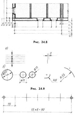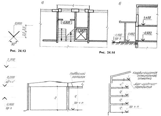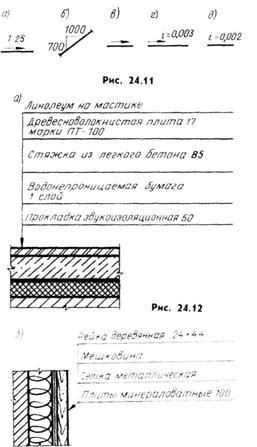 Размеры на строительных чертежах наносят: в миллиметрах на планах и разрезах зданий (допускается наносить размеры в сантиметрах, но в этом случае это указывается на чертеже в примечании); на рабочих чертежах отдельных узлов строительных конструкций; в метрах с тремя десятичными знаками высотные отметки на разрезах; в метрах на генеральных планах. Для указания границ измерения служат тонкие сплошные линии (выносные). Между выносными линиями проводят размерные линии с таким расчетом, чтобы выносная линия выходила за нее на 2...3 мм. Размерные линии на строительных чертежах допускается заканчивать засечкой в виде основной линии длиной 2...4 мм под углом 45°, проводимой с наклоном вправо к размерной линии, при этом размерные линии должны выступать за крайние выносные линии на 1... 3 мм. Размерные цифры ставят над размерной линией па расстоянии = 1 ММ. На строительных чертежах размеры допускается повторять и наносить в виде замкнутой цепи (рис. 1.8). Допускается проводить размерные линии непосредственно к линиям видимого контура, осевым, центровым и другим линиям, но не допускается использовать линии контура, осевые, центровые и выносные в качестве размерных. При нанесении размеров следует в основном руководствоваться ГОСТ 2.307-68. На строительных чертежах различают три вида размеров: номинальные (расстояние между координационными осями зданий); конструктивные - размеры элементов строительных изделий отличаются от номинальных на нормированный зазор, установленный нормами (толщина шва и др.); натурные- фактический размер элементов построенного здания; В некоторых случаях допускается вместо засечек ограничивать размерную линию точкой на пересечении с близко расположенными линиями чертежа (рис. 1.9. а) или стрелками для указания размеров диаметров и радиусов (рис. 1.9,6). При расположении ряда одинаковых элементов на равных расстояниях друг от друга (например, стен здания, отверстий и т. п.) размеры между элементами проставляются только в начале и конце ряда или указывается расстояние между крайними элементами (рис. 1.10). Перед размерным числом, определяющим уклон, проставляется стрелка, острием направленная в сторону уклона (рис. 1.11, а), или прямоугольный треугольник с проставленными на катетах абсолютными или относительными значениями их величин (рис. 1.11.(б). Уклон трубопроводов без указания размера обозначается стрелкой (рис. 1.11,в), а при необходимости указания стрелкой в сопровождении надписи (рис. 1.11,г); при отсутствии необходимости указания направления уклона приводится только надпись (рис. 1.11.д)). При нанесении на чертеже надписей, технических требований и при составлении таблиц необходимо руководствоваться указаниями ГОСТ 21.105 79 и ГОСТ 2.316-68. Выносные надписи к многослойным конструкциям наносятся в соответствии с рис. 1.12, а) и б), толщина слоев указывается в миллиметрах. Отметки для привязки элементов здания (сооружения) по высоте указываются в метрах с тремя десятичными знаками после запятой. За условную нулевую отметку, как правило, принимается отметка чистого пола 1-го этажа, обозначаемая 0,000. Отметки ниже нулевого уровня обозначаются со знаком минус, например — 0,250; отметки выше условной нулевой указываются без знака, например 3,100. Графическое обозначение отметки (рис. 1.13) дается в виде угольника; на планах в случае перепада уровня пола 