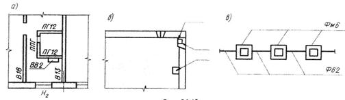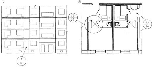 Координационные отметки верха чердачных перекрытий и перекрытий, совмещенных с кровлей (за исключением помещений с подвесным потолком), толщина которых условно принят равной толщине междуэтажного перекрытия, а при отсутствии таких перекрытий - координационные отметки низа несущих конструкций покрытий (стропильных ферм, балок) на опоре у наружных стен также следует совмещать с горизонтальными модульными координационными плоскостями (рис. 1.17). Минимальная высота букв и цифр на чертежах, выполненных тушью, 2,5 мм, а па чертежах, выполненных карандашом 3,5 мм. Название изображения наносится над изображением с минимальным разрывом. Название изображений и заголовки текстовых указаний допускается подчеркивать тонкой линией. Заголовки ведомостей и таблиц следуетi наносить над ними вне рамки и не подчеркивать. Если на листе расположено одно изображение (или группа изображений с общим названием), то его название (или общее название группы) приводится только в основной надписи. Наименование планов в основной надписи следует приводить в форме «План технического подполья» в наименовании разрезов, сечений и видов указывается обозначение соответствующей секущей плоскости, например. Разрез 2-1, Вид 2-2, в наименованиях фасадов указываются крайние оси, между которыми расположен фасад, например Фасад 1-12, в наименованиях фрагментов зданий, разрезов и фасадов указывается порядковый номер фрагментов, например Фрагмент плана 1. Типовые изделия (элементы конструкций) обозначают марками, присвоенными им соответствующими стандартами, чертежами типовых изделий или каталогами. Монолитным железобетонным участкам, конструкциям и элементам кроме буквенного обозначения присваивается дополнительный индекс «м», например: участок-Ум, плита-Пм, балка Бм, ребристая конструкция РКм и т.д. Марки изделий (элементов) наносятся рядом с ним или на полках линий-выносок (рис. 1.18, а); линия-выноска может заканчиваться стрелкой (рис. 1.18,6). Для маркировки нескольких одинаковых изделий (элементов) на чертежах наносятся линии-выноски с общей полкой (рис. 1.18, в). Марки изделий (элементов), изображенных контуром, допускается наносить в пределах контура. Марки нескольких повторяющихся изделий (элементов), изображенных контуром, допускается наносить только по концам ряда. Марки преобладающих на чертеже элементов на изображениях не наносятся, а оговариваются в текстовых указаниях. Номера позиций при указании дополнительных сведений наносятся в виде полных выносок, при указании диаметра и обозначения круглой стали и профиля (рис. 1.19, а), числа единиц в совмещенном изображении (рис. 1.19,6), шага расположения (рис. 1.19, в), ссылки на фрагменты (рис. 1.20,а и б)-как показано на соответствующих рисунках. Узлы на виде, разрезе, сечении обозначаются согласно примерам, данным на рис. 1.21, а 6, в. 1.18.