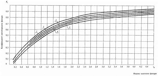 Kс - коэффициент светопередачи фонаря, определяемый для фонарей с диффузным отражением стенок по рисунку 12, а для фонарей с направленным отражением стенок - по рисунку 13 по значению индекса светового проема шахтного фонаря iф;