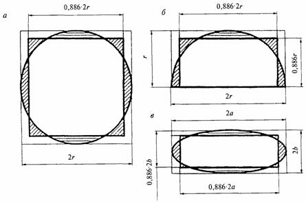 r - радиус окружности; а - большая полуось эллипса; b - малая полуось эллипса Рисунок 14 - Замена круглого (а), полукруглого (б) и эллиптического (в) светопроемов эквивалентными прямоугольными