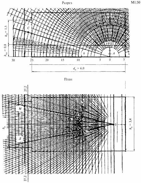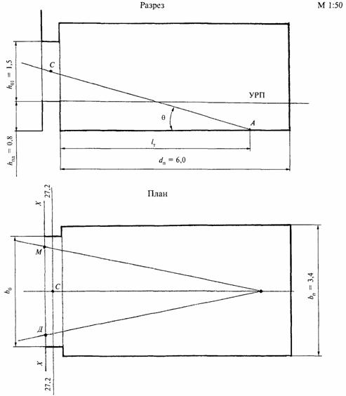 Рисунок 19 - Разрез и план жилой комнаты 10 По размерам помещения находят, что lT / dп = 0,83; bп / dп = 0,57. 11 По значениям dп / h 01; lT / dп, bп / dп; r cp в приложении Б линейной интерполяцией находят ro: ro = 4,5. 12 Учитывая, что глубина помещения dп = 6,0 м, по таблице 5 определяют 13 Для спаренного деревянного переплета с двойным остеклением определяют общий коэффициент светопропускания: t о = 0,8 х 0,75 = 0,60. 14 Подставляя значения коэффициентов ен, Kз, 15 Накладывают график II для расчета КЕО методом А.М. Данилюка (рисунок 10) на план помещения (рисунок 19) таким образом, чтобы ось графика и горизонталь 27,2 проходили через точку С; на внешней поверхности наружной стены отмечают точки пересечения луча 13,6 выше (точка М) и ниже оси графика (точка Д) с линией X - X; измеряют расстояние между точками М и Д т. е. d' = 4,6 см. 16 Учитывая, что жилая комната изображена на рисунках 18 и 19 в масштабе 1:50, определяют требуемую ширину окна bo = 50 х d' = 2,3 м. Окончательно принимают стандартный оконный блок размером 1,5 х 2,4 м. Примечание - Если помещение имеет балкон (лоджию), проверочный расчет выполняют так же, как и для помещения без балкона (лоджии), а наличие балкона или лоджии учитывают понижающим коэффициентом t4 из таблицы Б.8 приложения Б, который входит в общий коэффициент светопропускания t o.