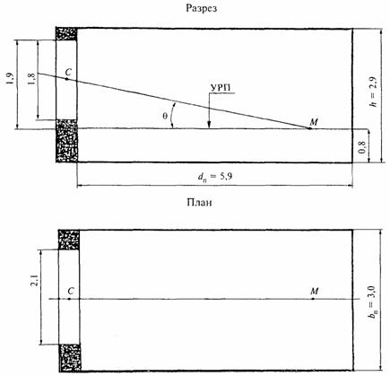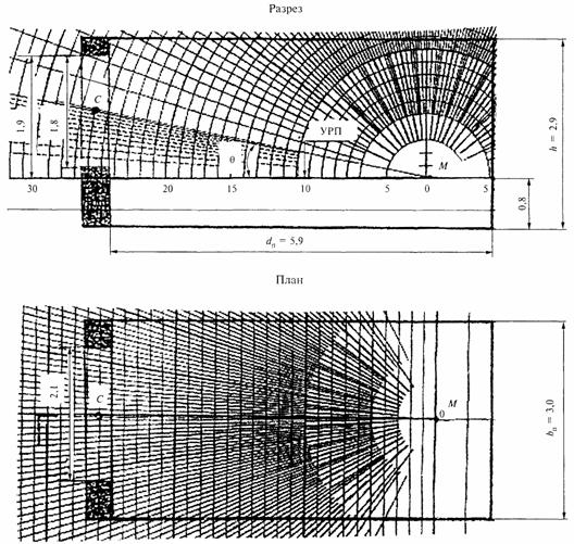 Рисунок 20 - Разрез и план рабочего кабинета Решение 1 Учитывая, что глубина помещения dп свыше 5 м (см. 8.8), по таблице 6 находят, что нормированное значение КЕО равно 0,6 %. 2 Производят предварительный расчет естественного освещения по исходной глубине помещения dп = 5,9 м и высоте верхней грани светового проема над условной рабочей поверхностью h 01 = 1,9 м; определяют, что dп / h 01 = 3,1. 3 На рисунке 2 на соответствующей кривой е = 0,6 % находят точку с абсциссой dп / h 01 = 3,1. По ординате этой точки определяют, что необходимая относительная площадь светового проема Aо/Aп = 21,5%. 4 Определяют площадь светового проема Ао по формуле 0,215 Ап = 0,215 · 17,7 = 3,81 м2. Следовательно, ширина светового проема bo = 3,81 / 1,8 = 2,12 м. Принимают оконный блок размером 1,8 х 2,1 м. 5 Производят проверочный расчет КЕО в точке М (рисунок 20) в соответствии с приложением Б по формуле Учитывая, что противостоящих зданий нет, e ЗД · KЗД = 0. 6 Накладывают график I для расчета КЕО методом А.М. Данилюка на поперечный разрез помещения (рисунок 21), совмещая полюс графика I - 0 с точкой М, а нижнюю линию - с условной рабочей поверхностью; подсчитывают число лучей по графику I, проходящих через поперечный разрез светового проема: n 1 = 2,96. 7 Отмечают, что через точку С на разрезе помещения (рисунок 21) проходит концентрическая полуокружность 26 графика I. 8 Накладывают график II для расчета КЕО на план помещения (рисунок 20) таким образом, чтобы его вертикальная ось и горизонталь 26 проходили через точку С; подсчитывают по графику II число лучей, проходящих от неба через световой проем: п 2 = 24. 9 Определяют значение геометрического КЕО по формуле e б = 0,01 n 1 n 2 = 0,01 · 2,96 · 24 = 0,71.