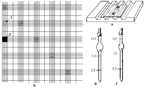 Мал.1. Лічильна камера Горяєва. А – лічильна камера (вид зверху). Б – сітка Горяєва (1 – малий квадрат; 2 – великий квадрат). В – змішувач для еритроцитів. Г - змішувач для лейкоцитів.