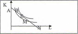 9. Закон убывающей предельной производительности утверждает: B. При найме дополнительного рабочего выпуск падает. C. При увеличении заработной платы, производительность сокращается. D. При найме дополнительного рабочего предельная производительность растет;. E. Производительность имеет тенденцию к росту. 10. Дана производственная функция Y=25K0>3L0' Определите эффект от масштаба роста: A. Убывающий. B. Возрастающий. C. Постоянный. D. Нулевой. E. Положительный. 11. Дана производственная функция Y=25K°'3L0'1. Определите коэффициенты эластичности: A. 0,3; 0,1. B. 25; 0,1. C. 0,4; 0,5. D. 0,5; 0,1. E. 25; 0,5. 12. В какой точке на рисунке наблюдается оптимум производителя: