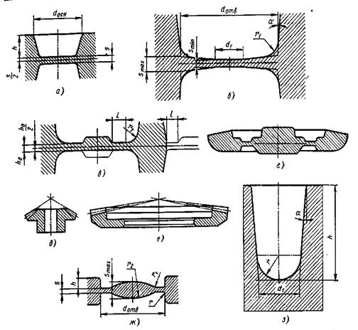 Рис. 2.10. Перемычки в наметках отверстий и углубления: а) плоская, б) с раскосом, в) с магазином, г) сдвоенная поковка, д) и е) детали, ж) перемычка с карманом, з) глухая наметка (углубление)