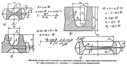 Для низких поковок при D/H>15 рекомендуется наметка с карманом (рис.10, г), в этом случае: S=0,4ÖD, мм; S1 = 5S, мм; S=0,45Ö(D-0,25h-5)+ 0,6Ö h, мм R1= R+0,1h+2,мм R2=5h, мм; R3 – находят графически, мм На рис. 2.11. представлены наметки отверстий для поковок из цветных металлов и сплавов и соответствующие формулы для расчета конструктивных элементов. Данные к рис. 2.11,г сведены в табл. П.27. и П.28.