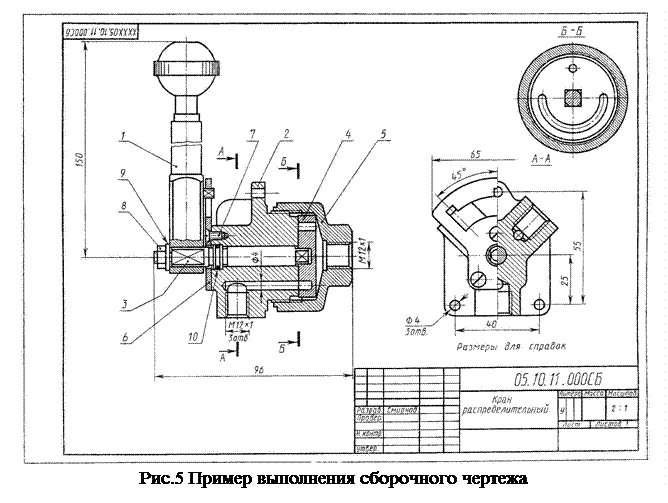 Так, на рис. 5 резьба на корпусе (стержень) закрывает частично резьбу на крышке. Валик 3, винт 7, гайка 8 и шайба 9,хотя через их оси и проходит фронтальная секущая плоскость, показаны согласно пункту 6.5 ГОСТ 2.305-68 нерассеченными. Шлицы у винтов изображены линией толщиной 2s. Нанести номера позиций, пользуясь спецификацией; нанести размеры. При этом пользоваться указаниями, приведенными ниже. Заполнить основную надпись и выполнить надписи, располагаемые над ней (технические требования). В данном примере над основной надписью помещено указание о том, что все размеры справочные. Внимательно просмотреть чертеж и обвести его карандашом, придав линиям видимого контура толщину 0,8-1 мм, линиям невидимого контура, если таковые на сборочном чертеже имеются – 0,4-0,5 мм, всем остальным – 0,25-0,3 мм. О нанесении номеров позиций. Правила нанесения номеров позиций на сборочных чертежах изложены в двух стандартах – ГОСТ 2.109-73 и 2.316-68. Ниже приводятся наиболее существенные правила. 1. На сборочном чертеже составные части изделия нумеруют в соответствии с номерами позиций, указанными в спецификации этого изделия. Номера позиций указывают на полках линий-выносок, проводимых от изображений составных частей. 2. Номера позиций указывают на тех изображениях, на которых соответствующие составные части проецируются как видимые, как правило, на основных видах и заменяющих их разрезах. 3. Номера позиций располагают параллельно основной надписи чертежа вне контура изображений и группируют в колонку или строчку по возможности на одной линии. 4. Номера позиций наносят на чертеж, как правило, один раз. 5. Размер шрифта номеров позиций должен быть на один-два размера больше, чем размер шрифта, принятого для размерных чисел на том же чертеже (рекомендуется шрифт размера 7). 6. Линию-выноску от составных частей изделия проводят тонкой сплошной линией и заканчивают точкой, которую наносят на изображение данной составной части. У зачерненных или узких поверхностей точка заменяется стрелкой (см. позиции 9 и 10 на рис.5 ) 7. Линии-выноски не должны пересекаться между собой, быть не параллельными линиям штриховки (если линия-выноска проходит по заштрихованному полю) и не пересекать по возможности размерные линии и изображения составных частей, к которым не относится данная линия-выноска. 8. 9. Допускается делать общую линию-выноску с вертикальным расположением номеров позиций для группы крепежных деталей, относящихся к одному и тому же месту крепления (рис.2). 10. Полки линий-выносок проводят тонкой сплошной линией. О размерах на сборочном чертеже. Согласно ГОСТ 2.109-73, на сборочном чертеже наносят следующие справочные размеры: 1. Габаритные (см. размеры 65; 96; 150 на рис.5). Если изделие имеет наружные перемещающиеся части, изменяющие ее габарит, то допускается их указывать в крайних или промежуточных положениях с соответствующими размерами. 2. Установочные, необходимые для установки изделия на месте работы (см. размеры 25; 40; 55 на рис.5 ) 3. Присоединительные, характеризующие величины элементов, по которым будет осуществлено присоединение к изделию других изделий (размеры M12 на рис.5). К ним также относятся параметры зубчатых колес, служащих элементами внешней связи, и т. п. 4. Параметрические, характеризующие эксплуатационные показатели сборочной единицы, например, диаметр проходного отверст