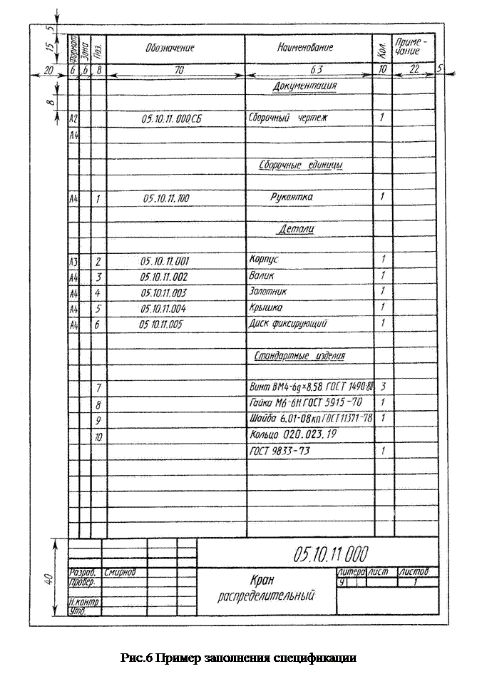 Наименование каждого раздела указывают в виде заголовка в графе «Наименование» и подчеркивают тонкой линией. Ниже каждого заголовка должна быть оставлена одна свободная строка, выше – не менее одной свободной строки (для возможных дополнительных записей). Наименование детали записывают в именительном падеже единственного числа. Если наименование состоит из двух слов, то на первом месте пишут имя существительное, например «Гайка накидная», а не «Накидная гайка» и т. п. В графе «Кол.» указывается количество составных частей на одно изделие. Более подробные указания о заполнении спецификации см. в ГОСТ 2.108-68 или в справочной литературе.