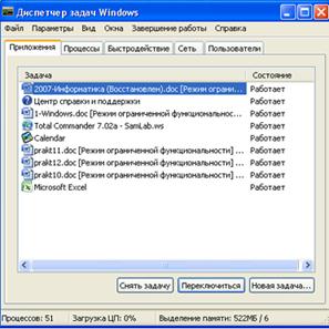 Для выполняемых программ можно просмотреть их состояние и завершить не отвечающих на запросы. Также имеется возможность просмотра наиболее часто используемых показателей быстродействия процессов, графиков и сведений об использовании ЦП и памяти. Кроме того, если имеется подключение к сети, можно просматривать состояние сети и параметры ее работы. Если к компьютеру подключились несколько пользователей, можно увидеть их имена, какие задачи они выполняют, а также отправить им сообщение. ОС рассматривает все объекты представленные в ней как файлы программы, документы, указатели, папки. · Программа – исполняемый файл, · документ – файл специального формата который вызывает на выполнение связанную с ним программу, · указатель – файл ссылка на местоположение объекта, · каталог – файл представляющий список содержащихся в нем объектов (файлов и других каталогов), Основные действия которые можно выполнить с любым объектом или группой объектов в файловой системе: создать, удалить, копировать, вырезать, вставить. Для создания объекта надо: 1. В папке в которой мы хотим создать объект на пустом месте вызвать контекстное меню и выбрать команду создать Øили выполнить в окне программы Проводник последовательность действий ФайлØсоздать. · Чтобы выделить несколько подряд идущих объектов, выберите первый и, удерживая нажатой клавишу SHIFT, выберите последний объект. Для выбора разрозненных файлов или папок щелкните поочередно каждый объект, удерживая нажатой клавишу CTRL для выбора всех объектов в папке нажмите CTRL + A. Для выполнения действий с существующим объектом его необходимо: 2. Выделить (выбрать) файл или папку, которые следует скопировать. · Чтобы выделить несколько подряд идущих объектов, выберите первый и, удерживая нажатой клавишу SHIFT, выберите последний объект. Для выбора разрозненных файлов или папок щелкните поочередно каждый объект, удерживая нажатой клавишу CTRL для выбора всех объектов в папке нажмите CTRL + A. А после этого: 3. Выбрать соответствующую действию команду в главном или контекстном меню или расположенной в правой части окна панели задачи для файлов и папок. · Все операции также можно выполнить с помощью комбинаций клавиш: копировать – CTRL + C, вставить – CTRL + V, вырезать – CTRL + X или при помощи перетаскивания мышью Перетаскивание (Drag and Drop) – этоперемещение выбранного элемента на экране путем его переноса с помощью указателя при нажатой кнопке мыши. Например, для перемещения окна можно перетащить его по экрану за строку заголовка. · Если перетаскивать объект при нажатой правой кнопке мыши, это позволит выбрать одну из трех операций — перемещение, копирование или создание ярлыка объекта. · Чтобы при перетаскивании элемент был скопирован, а не перемещен, перетаскивайте его при нажатой клавише CTRL. · При перетаскивании элемента на другой диск объект будет скопирован, а не перемещен. Чтобы переместить объект, удерживайте нажатой клавишу SHIFT при перетаскивании. · При перетаскивании программы на новом месте создается ее ярлык. Чтобы переместить саму программу, щелкните ее правой кнопкой мыши и затем перетащите. Для перемещения программы необходимо войти в систему в качестве администратора. Контрольные вопросы для самопроверки 1. Что такое папка, ярлык и для чего они служат? 2. Где располагаются системные пиктограммы? 3. Как 