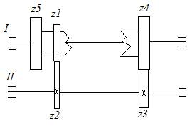 Изменить частоту вращения валов с помощью сменных колес - целесообразно при длительной работе станка без перенастройки, т.к. замена колес требует затраты времени. Широкое распространение получили механизмы, состоящие из передвижных многовенцовых зубчатых колес. Количество колес в блоке чаще всего 2, 3, реже 4. Блоки применяются в качестве ведущих и ведомых элементов. При перемещении колеса, блоки перемещаются на шлицах вдоль оси вала и поочередно входят в зацепление с сопряженными колесами. Если применять корригизованное зацепление колес с разной длинной зубьев при одном межцентровом расстоянии, то в отдельных случаях двухвенцовый блок может быть заменен одним колесом z1-3, зацепляющимся поочередно с колесами z2 и z4. Основное достоинство механизмов с передвижными блоками – простота. Колеса, не участвующие в передаче рабочих нагрузок, не изнашиваются. К числу недостатков относят невозможность переключения передачи на ходу и сравнительно большие осевые размеры. Этих недостатков лишены механизмы, у которых зубчатые колеса находятся в состоянии зацепления и включаются в работу муфтой. Если муфта фрикционного типа, то частоту вращения можно изменять на ходу. Передачи z1 – z2 и z3 - z4 могут быть косозубыми. В последнее время муфты получили очень широкое распространение, т.к. позволяют простыми средствами автоматизировать привод. Для регулирования частоты вращения вала применяют и так называемые переборные устройства (степень возврата). Вращение колеса z1, осуществляемое колесом z5, может быть передано валу I через перебор по цепи z1 – z2 , z3 - z4 и непосредственно, если переместить колесо z4 влево до сцепления торцевых кулачковых полумуфт. Вал II, колеса z2 и z3 называют перебором.