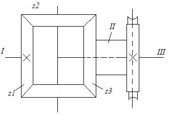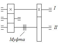Работа реверсивных устройств с цилиндрическими колесами основана на том, что при подаче движения через два зубчатых колеса валы I и II вращаются в различных направлениях, а при передаче через три зубчатых колеса – в одном направлении.