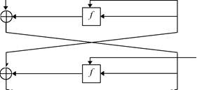 (V Дешифрирование Рис. 13-3. Один этап FEAL. Функция f берет 32 бита данных и 16 битов ключа и смешивает их вместе. Сначала блок данных разбивается на 8-битовые кусочки, которые затем объединяются с помощью XOR и заменяют друг друга. Блок-схема фун к-ции f представлена на 9-й. Две функции S0h Si определяются следующим образом: S0(a,b) = циклический сдвиг влево на два бита ((а + Ъ) mod 256) Si(a,b) = циклический сдвиг влево на два бита((а + Ъ + 1) mod 256) Ъ f{ab} So I So