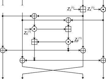 У Y2 Уз X: 16-битовый подблок открытого текста Y, ■ 16-битовый подблок шифротекста Z/r): 16-битовый подблок ключа Ф: побитовое "исключающее или" (xoR) 16-битовых подблоков ЕВ: сложение по модулю 216 16-битовых целых ©: умножение по модулю 216+1 16-битовых целых при условии, что нулевой подблок соответствует 2 Рис. 13-9. IDEA. Выходом этапа являются четыре подблока - результаты действий (И), (12), (13) и (14). Поменяйте местами два внутренних подблока (но не в последнем этапе), и вы получите исходные данные для следующего этапа. После восьмого этапа выполняется заключительное преобразование: (1) Перемножаются Хх и первый подключ. (2) Складываются Х2 и второй подключ. (3) Складываются Х3 и третий подключ. (4) Перемножаются Х4 и четвертый подключ. Наконец четыре подблока снова соединяются, образуя шифротекст. Также несложно создавать подключи. Алгоритм использует 52 из них (шесть для каждого из восьми этапов и еще четыре для заключительного преобразования). Сначала 128-битовый ключ делится на восемь 16-битовых подключей. Это первые восемь подключей алгоритма (шесть для первого этапа и два - для второго). Затем ключ циклически сдвигается налево на 25 битов и снова делится на восемь подключей. Первые четыре используются на этапе 2, а оставшиеся четыре - на этапе 3. Ключ циклически сдвигается налево на 25 битов для получения следующих восьми подключей, и так до конца алгоритма. Дешифрирование выполняется точно также за исключением того, что подключи инвертируются и слегка и з-меняются. Подключи при дешифрировании представляют собой обратные значения ключей шифрования по отношению к операциям либо сложения, либо умножения. (Для IDEA подблоки, состоящие из одних нулей, считаются равными 216 = -1 для умножения по модулю 216 + 1, следовательно, обратным значением 0 относительно умножения является 0.) Эти вычисления могут занять некоторое время, но их нужно выполнить один раз для каждого ключа дешифрирования. В Табл. 13-4 представлены подключи шифрования и соответствующие подключи дешифрирования. Табл. 13-4. Подключи шифрования и дешифрирования IDEA