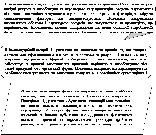 В економічній теорії існує кілька концепцій підприємства (фірми), які описують його виникнення, діяльність і ліквідацію. Серед них можна виокремити основні: неокласичну; інституціональну; еволюційну; підприємницьку, агентську та інтеграційну. Кожна з них акцентує увагу на тих чи інших особливостях підприємства як об'єкта дослідження.