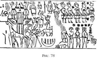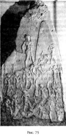 Изображение на шумерской стеле, в настоящее время хранящейся в Лувре, вполне может представлять собой рассказ о событиях, нашедших отражение в Книге Бытия. Эта стела была сооружена примерно в 2300 году до нашей эры аккадским царем Нарам‑Сином, и ученые полагали, что на ней увековечены победы правителя над врагами Аккада. Однако большая центральная фигура изображает не смертного правителя страны, а бога – его голову украшает рогатый шлем, носить который было исключительной прерогативой богов. Более того, эта центральная фигура, похоже, не является лидером меньших по размерам людей, а топчет их. Люди, в свою очередь, не сражаются друг с другом, а движутся по направлению к большому коническому объекту и в немом восхищении стоят перед ним; на этом же объекте сосредоточено внимание божества. В позе бога, вооруженного луком и копьем, читается скорее угроза, чем восхищение (рис. 75). Изображенный на стеле объект конической формы устремлен к трем небесным телам. Его размеры, форма и назначение указывают, что это «шем», и в таком случае вся сцена изображает разгневанного бога в полном вооружении, топчущего людей, которые радуются постройке «шема». И в месопотамских текстах, и в библейских легендах прослеживается одна и та же мысль: летающие машины предназначены для богов, а не для людей. Люди – это подчеркивается во всех источниках – могут достичь Небесной Обители только по воле богов. Это подтверждают другие истории о вознесении на небо и даже о космических полетах.
