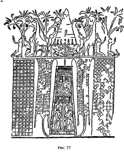 Когда Гильгамеш рассказал о своем божественном происхождении, о цели своего путешествия («Хочу узнать о смерти и жизни от Утнапишти»), а также о том, что ему покровительствует Уту/Шамаш, охранники пропустили его. Продолжая идти «путем Шамаша», Гильгамеш оказался в полной темноте, перестав видеть, что происходит впереди и позади него, и «закричал от страха». Пройдя много «беру» (единица времени, расстояния или небесной дуги у шумеров), он все еще не выбрался из тьмы. Наконец, на двенадцатом «беру» впереди забрезжил свет. Далее поврежденный и местами неразборчивый текст повествует о том, как Гильгамеш очутился в чудесном саду, где деревья и плоды на них были вырезаны из полудрагоценных камней. Именно здесь жил Утнапишти. Гильгамеш задал не дававший ему покоя вопрос предку и получил ответ, который его разочаровал: человеку, сказал Утнапишти, не дано избежать смерти. Тем не менее он подсказал Гильгамешу, как отдалить смерть, открыв ему место, где растет Трава Молодости, с помощью которой «юнцом вдруг станет дряхлый старец». Обрадованный Гильгамеш нашел траву, но по глупости потерял ее на обратном пути и вернулся в Урук с пустыми руками. Если Отвлечься от литературной и философской ценности эпической поэмы, то‑история Гильгамеша интересна, в первую очередь, своими «воздушно‑космическими» аспектами. «Шем», требовавшийся Гильгамешу для того, чтобы достичь Обители Богов, был, вне всякого сомнения, космической ракетой, старт которой он наблюдал, когда приблизился к месту, «где в небеса врата лежат». По всей видимости, ракеты находились внутри горы, окрестности которой представляли собой запретную, тщательно охраняемую зону. До сих пор не найдено ни одного изображения сцены, свидетелем которой стал Гильгамеш. Правда, обнаружен рисунок в гробнице египетского наместника, с изображением головной части ракеты в местности, где растут финиковые пальмы. Совершенно очевидно, что основная часть ракеты располагается под землей в рукотворной шахте, состоящей из трубчатых сегментов и украшенной леопардовыми шкурами (рис. 77).