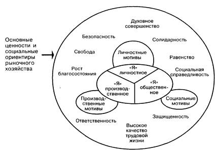 ВОПРОСЫ К СИТУАЦИИ 1. Дайте личностную характеристику Петера Гиффена. Какой тип поведения на работе и вне ее у него сложился? 2. В чем состоит проблема взаимодействия Петера с организацией? Что является источником этой проблемы? 3. Как пытается Петер Гиффен решать свои проблемы взаимоотношения с организацией? 4. Что вы можете сказать о стиле решения проблем Петера с его начальниками? 5. Используя положения теории научения, предложите план действий для Джой Легран. Изучив данный параграф, вы узнаете о предыстории возникновения понятия «мотивация», об ее сущности и взаимосвязи с такими категориями, как потребности, стимул, цель, действие, а также о механизме мотивации персонала. Здесь рассматриваются три группы теорий, с различных позиций изучающих процесс мотиваци-онного воздействия — содержательные, теории «поля» и процессуальные, — а также анализируется, на удовлетворение каких потребностей вправе рассчитывать работник, каковы критерии разумности его потребления. Каждый человек — это уникальный и сложный мир, обладающий множеством особенностей включения его в экономический механизм страны. Облик человека в современном рыночном хозяйстве можно представить следующим образом (рис.). Атмосфера, благоприятствующая или, наоборот, препятствующая формированию позитивной мотивации работника, создается теми критериями и ценностями, которые определяют работу социально-экономического механизма рыночного хозяйства. Обеспечение свободной конкуренции с помощью честных правил игры, удовлетворение разнообразных социально-политических интересов трудящихся, стабилизация и сбалансированность товарно-денежной системы, высокие нравственные принципы развития свободы, демократии и прогресса способствуют правильному формированию и раскрытию внутренних и внешних «Я»-образов человека, выбору им своего места в рыночном хозяйстве, формированию его жизненных убеждений и твердой позиции, уверенности в будущем. Это воздействие приобретает свою интегрированную завершенную форму на конкретном рабочем месте, в учреждении или на предприятии. При этом политика самого предприятия не должна приходить в противоречие с той системой взглядов, норм, ценностей, отношений к труду, которая формиро