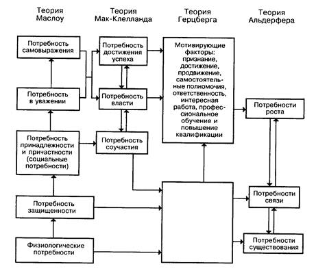 Рис. 3. Содержательные теории Формы их удовлетворения напрямую связаны с материальным стимулированием. Высшие потребности социальны в плане их формирования и духовны в плане их ощущения индивидом. Они удовлетворяются лишь посредством использования высших психических функций человека, и прежде всего творческой трудовой деятельности. Второй вывод заключается в том, что под трудовой деятельностью подразумевается только творческая деятельность, связанная с реализацией сложных и многоплановых задач, в которой полностью самовыражается личность. Применяемая для стимулирования трудовой деятельности методика двойной мотивации предполагает материальное стимулирование на уровне, необходимом для удовлетворения низших потребностей, а социальное и духовное стимулирование — на уровне всевозрастающих высших потребностей работника. Это учение Л.С. Выгодского было продолжено в работах его учеников А.Н. Леонтьева и Б.Ф. Ломова. В основу всех рассматриваемых теорий заложено изучение потребностей и их мотивационного воздействия на человека. Вместе с тем в каждой из теорий присутствуют и принципиально новые взгляды на движение потребностей и характер их мотивирующего влияния на человека. В теории Альдерфера движение осуществляется не только по иерархии снизу вверх (как у Маслоу), но и в противоположном направлении. Мак-Клелланд вводит идею о постоянном совершенствовании самой иерархии путем приобретения и развития новых потребностей под влиянием жизненного опыта и окружающей среды. Герцберг выявил, что не все потребности постоянно мотивируют человека, а только те из них, которые ведут к развитию состояния удовлетворенности. Параллельное и самостоятельное существование механизмов удовлетворения низших потребностей, по Л.С. Выгодскому, диктует необходимость создания различных систем стимулирования. Вторая группа теорий мотивации может быть условно названа теориями «поля». В механизме мотивации эта группа занимается изучением этапа «стимул—цель», определяя, каким образом среда обитания и организационная культура предприятия («поле») стимулируют трудовую деятельность работника и формируют его мотивационную сферу. Попыткой заглянуть в глубинные социальные процессы формирования потребностей и на их основе мотивов как функции среды обитания индивида является концепция профессора Мичиганского университета Д.Мак-Грегора, получившая название «теории У». Согласно этой теории большинство людей вовсе не ненавидят работу, как утверждала «теория X». Работать для них также естественно, как и отдыхать. Именно поэтому не следует угрозами и принуждением заставлять людей работать. Нужно создать среду, благоприятствующую проявлению человеком лучших своих качеств, в том числе и преданности целям организации. Тогда эта преданность и заинтересованность будут проявляться в той степени, в которой работник увидит в реализации общих целей способ удовлетворить свои потребности высшего порядка. В такой среде работники сами создадут себе стимулы для того, чтобы успешно решать цели организации. Эта теория получила свое дальнейшее продолжение в «теории 7», разработанной профессором Калифорнийского университета В. Оучи на основе изучения японского опыта мотивации персонала. Ее суть заключается в создании ситуации отождествления ра