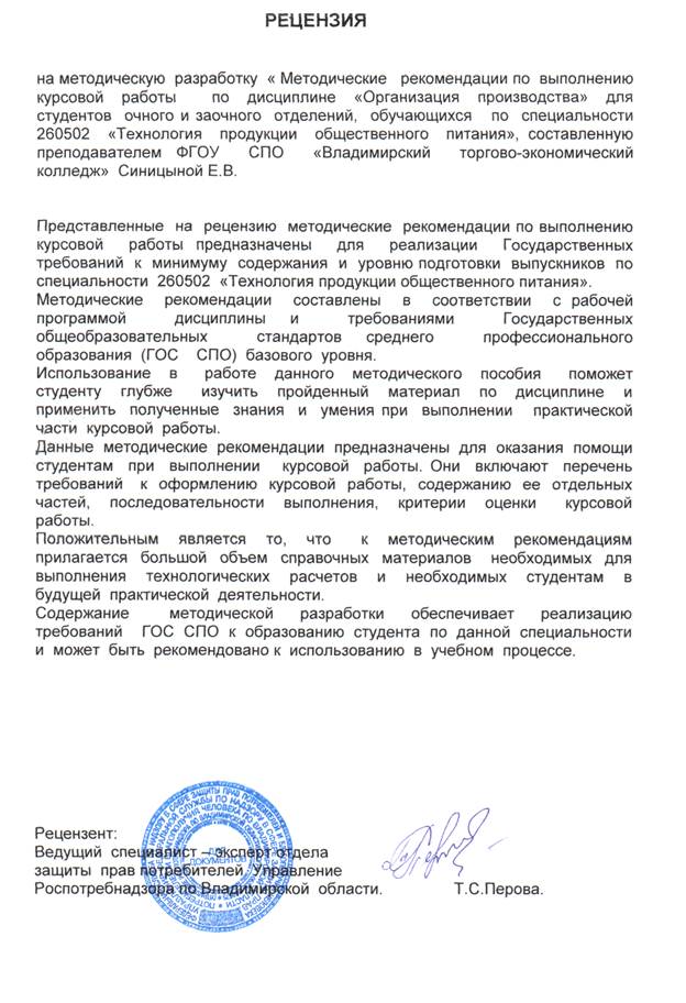 ПОЯСНИТЕЛЬНАЯ ЗАПИСКА. Методические рекомендации по выполнению курсовой работы по дисциплине «Организация производства» предназначены для студентов очного и заочного отделений, обучающихся по специальности 260502 «Технология продукции общественного питания». Методические рекомендации составлены в соответствии с рабочей программой дисциплины и требованиями Государственных образовательных стандартов среднего профессионального образования (ГОС СПО) базового уровня в части Государственных требований к минимуму содержания и уровню подготовки выпускников по специальности 260502. Выполнение курсовой работы студентами предусмотрено на 3 курсе, после изучения дисциплины «Организация производства». Подготовка и написание курсовой работы включает ряд последовательных этапов: · Выбор темы работы и получение от руководителя рекомендаций по методам исследования и источникам информации. · Изучение литературы и ее анализ. · Разработка плана курсовой работы. · Проведение технологических расчетов. · Оформление курсовой работы и рецензирование ее руководителем. · Защита курсовой работы. Данные методические рекомендации позволят студентам систематизировать и закрепить полученные теоретические знания и практические умения по дисциплине, помогут правильно произвести технологические расчеты и исследования по теме работы, а также продемонстрировать степень профессиональной подготовки.