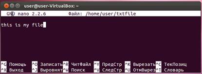 Команды для редактирования файлов, используя текстовые редакторы: Для редактирования файла можно использовать встроенный консольный текстовый редактор. Для этого необходимо набрать следующую команду: nano путь к файлу nano ~/txtfile (~ значит, что файл txtfile находится в домашней директории )
