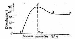 Норма осушення залежить від: 1) виду сільськогосподарських культур (вологості ґрунту в зоні активного водоспоживання, глибини розміщення основної маси кореневої системи, яка становить у середньому 0,5м); 2) видів ґрунту і в першу чергу від висоти капілярного підняття вологи в ньому; 3) періоду вегетації (норми осушення встановлюють у посівний, вегетаційний та збиральний періоди); 4) кліматичних факторів під час росту рослин (опадів та випаровування). Для рослин, які менше вимогливі до умов аерації і мають неглибоку кореневу систему та велике водоспоживання, норми осушення приймаються меншими. Вони менші для ґрунтів, що мають невелику висоту капілярного підняття (піщані ґрунти), а також у сухі та теплі періоди. Норми осушення за вегетаційний період (табл. 2.1.) відносяться до середнього за вологістю року. У вологі роки для підтримання заданої вологості ґрунту норми осушення необхідно збільшити на 15...20%, а у посушливі - відповідно зменшити. Дослідження, проведені в останні роки, показали, що пониження рівня ґрунтових вод на величину, яка більше середньо-вегетаційних норм осушення, не приводить до значного зменшення врожаїв сільськогосподарських культур. Узагальнена крива зв'язку врожаїв з глибинами залягання ґрунтових вод (по Б. С. Маслову) наведена на рис. 2.2. На цій кривій можна виділиш такі характерні ділянки і точки: ділянка ділянка точка ділянка ділянка
