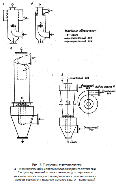 Вихревые пылеуловители были разработаны значительно позже циклонов и отличаются от последних наличием в аппарате двух встречных в осевом направлении закрученных потоков: нижнего (первичного) и верхнего (вторичного). Принцип действия вихревых аппаратов аналогичен принципу действия циклонов. В таких аппаратах на частицы пыли также действуют центробежные силы, которые возникают при вращении потока газа. Для создания закручивания потока газа используются специальные завихрители, которые могут быть выполнены в виде лопаток или сопел (рис.18). Кроме того, поток очищаемого газа получает дополнительное закручивание за счет введения в верхнюю часть аппарата вторичного газового потока, направленного тангенциально. В качестве вторичного потока может использоваться атмосферный воздух, часть периферийного потока очищенного газа или запыленный газ. Расход вторичного газа обычно составляет 30–40% от расхода первичного газа, его давление 5–6 кПа. При подаче запыленного газа одновременно по обоим каналам частицы пыли, поступающие в вихревой пылеуловитель по верхнему каналу, отбрасываются центробежными силами к стенке аппарата, движутся вдоль нее вниз по спирали и попадают в пылевой бункер; частицы пыли, поступающие в аппарат по нижнему каналу, сначала с потоком газа поднимаются по спирали, затем под действием центробежных сил отбрасываются к стенке и с вторичным, верхним потоком газа движутся вниз, также попадая в пылевой бункер. Варианты конструкций вихревых пылеуловителей показаны на рис. 18 [8,11]. По вводу верхнего, вторичного потока газа вихревые пылеуловители разделяют на пылеуловители с сопловым (рис.18, а), лопаточным (рис. 18, б) и тангенциальным (или улиточным) (рис. 18, в) вводом верхнего потока газа. В вихревых пылеуловителях с сопловым вводом вторичный газовый поток закручивается системой тангенциальных сопел. В верхней части пылеуловителя устанавливают несколько рядов сопел, обычно наклоненных к горизонтали под углом 15–30°. Газ поступает в распределительную камеру, где он находится под большим давлением, и выходит через сопла с относительно большой скоростью – 60–80 м/с. В аппаратах с сопловым вводом вторичного газа его объемный расход составляет 30–50% от общего расхода газа. В пылеуловителях с верхним лопаточным и тангенциальным вводом давление на вторичном вводе значительно меньше, чем на сопловом. Обычно давление и скорость входа вторичного газа примерно такие же, как и у циклонов. В масштабах производства удобнее и экономичнее использовать вихревые пылеуловители с верхним и нижним тангенциальными вводами (проще конструктивно, меньше потери давления). Вихревой пылеуловитель (рис. 18, в) разработан в Московском текстильном институте (МТИ). В этой конструкции ввод верхнего газового потока наклонен к горизонтальной оси на 15° (как у циклона ЦН–15); сечение входных каналов таково, что устанавливается необходимое соотношение между расходами газа по верхнему и нижнему каналам (65% газа подают по верхнему каналу, 35% – по нижнему). Аналогом высокоэффективного циклона СК–ЦН–34 является конический вихревой пылеуловитель (рис.18, г). Такие пылеуловители внедрены на линиях аспирации пыли фосфоритов на ПО „Фосфор" (г.Чимкент), на Михайловском горно-обогатительном комбинате для улавливания пыли известняка и железных окатышей.
