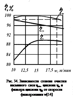 2. По графику (рис.34) для вычисленной степени очистки находим требуемую величину скорости фильтрации w = 18,9 м/мин. 3. Вычисляем предварительно требуемую величину площади фильтрования, м2