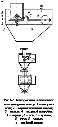 Одним из распространенных типов затворов являются затворы типа «Мигалка» (рис. 62), которые бывают одинарными и двойными. Двойные затворы типа «Мигалка» устанавливают при разрежении до 2000 Па. Недостаток затворов типа «Мигалка» – наличие значительных подсосов воздуха, что отрицательно сказывается на степени очистки пылеулавливающих аппаратов. Более высокую герметичность обеспечивают затворы с электроприводами, выполненные в виде вращающихся лопастных роторов или шнеков (рис. 63). Лопастные затворы могут обеспечивать удовлетворительную герметичность при условии, что их пропускная способность соответствует расходу пыли. Практически такой режим обеспечить очень трудно.
