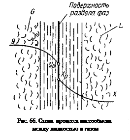 Процесс переноса вещества из одной фазы в другую можно представить следующим образом (рис.66). Пусть концентрация распределяемого вещества в фазе G выше равновесной и вещество переходит из фазы G в фазу L. Распределяемое вещество в фазе G переносится к поверхности раздела фаз, а в фазе L переносится от этой поверхности. Перенос вещества в обеих фазах осуществляется путем молекулярной диффузии (т. е диффузии молекул через слойносителя) и путем конвективной диффузии (т. е. движущимися частицами носителя и распределяемого вещества). В каждой фазе различают две области: ядро (основная масса) и пограничный слой, образующийся у поверхности раздела фаз. Перенос распределяемого вещества в ядре фазы, где обычно происходит интенсивное перемешивание, осуществляется преимущественно путем конвективной диффузии. Вследствие интенсивного перемешивания в ядре концентрация распределяемого вещества в каждом сечении системы почти постоянна. Концентрация распределяемого вещества в фазе G уменьшается от величины y в ядре потока до величины y р на границе раздела фаз. В фазе L концентрация распределяемого вещества уменьшается от величины xр на границе раздела фаз до величины x в ядре потока. При установившемся процессе на границе раздела фаз наблюдается равновесие, т. е. концентрации yр и xр являются равновесными, т.е. равными y * и x *. ВОПРОС 42 В процессах физической абсорбции перенос вещества в пределах фазы определяется уравнениями массоотдачи: