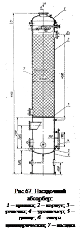 Эффективность массопередачи в насадочных колоннах зависит от равномерности распределения потоков контактирующих фаз, соотношения их скоростей и условий орошения элементов насадки. Начальная равномерность распределения абсорбента достигается посредством ее диспергированной подачи на поверхность насадки через распылительные форсунки или распределительные тарелки с большим числом отверстий. При дальнейшем передвижении жидкости ее контакт с газовой фазой ухудшается из-за оттока к стенкам колонны. Поэтому высоту насадки делят на несколько слоев (ярусов), устанавливая между ними перераспределительные устройства. Для этой цели могут использоваться ситчатые или перфорированные диски (тарелки). Одновременно они выполняют функцию несущей конструкции для каждого яруса. Поскольку часть отверстий тарелки может быть завалена элементами насадочного слоя, то она должна превосходить насадку по величине живого сечения. Недостаточное орошение элементов насадки ведет к неполному использованию поверхности ее контакта. Значительный избыток жидкости может вызвать частичное затопление насадки, что также ведет к ухудшению контакта фаз на поверхности насадочных элементов. Точный расчет пределов плотности орошения невозможен. Ориентировочно минимальную плотность орошения ρн, м3/ч на 1 м2 поверхности насадки (сечения скруббера), можно принять как 0,12 a, где a – удельная поверхность насадки, м2/м3, а максимальную плотность орошения – в 4–6 раз выше минимальной. Существуют и другие, более сложные эмпирические соотношения для определения плотности орошения.